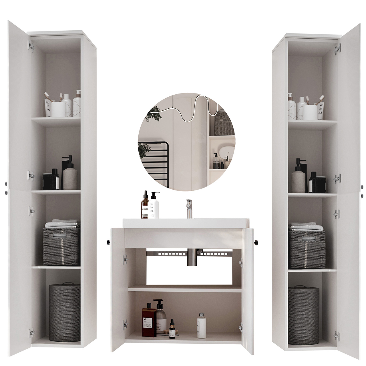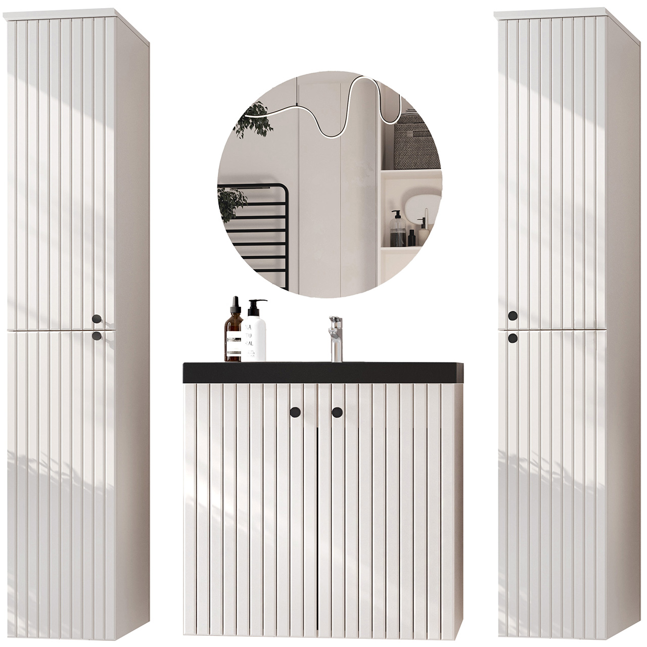 Mueble de baño ASTO 01 (30/162/32) x2 Mueble para lavabo ASTO 02 (60/58/36) Espejo redondo de baño MIR2 (60/60) |