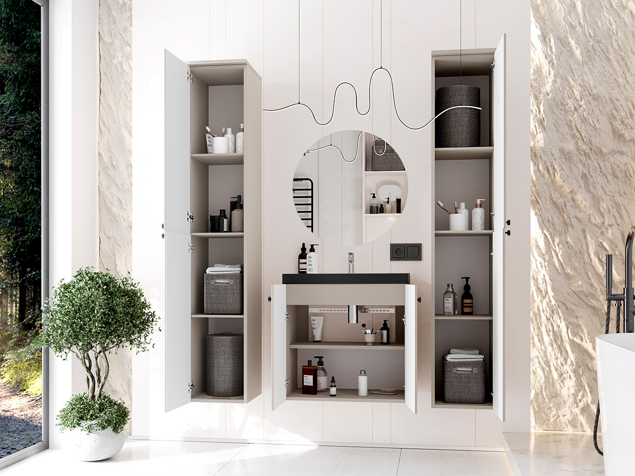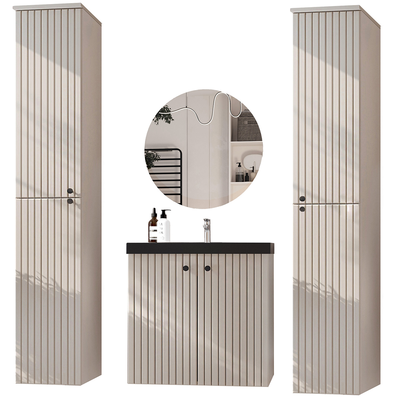 Mueble de baño ASTO 01 (30/162/32) x2 Mueble para lavabo ASTO 02 (60/58/36) Espejo redondo de baño MIR2 (60/60) |